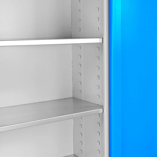 Der ADB Flügeltürenschrank aus pulverbeschichtetem Qualitätsstahlblech ist mit 4 verstellbaren Fachböden aus verzinktem Stahlblech ausgestattet. Jeder Fachboden kann maximal mit 50 kg belastet werden (bei gleichmäßiger Belastung). Die 2 verstärkten Türen mit 2-Punkt-Sicherheitsverriegelung bietet starken Diebstahlschutz.