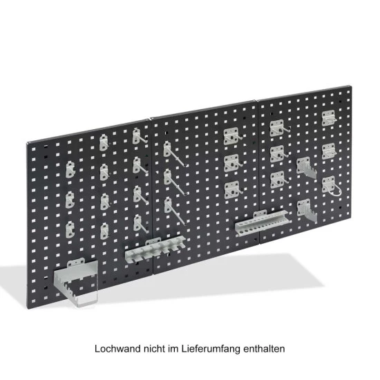 Bitte beachten Sie: Die abgebildete Lochwand gehört nicht zum Lieferumfang. Werkezughalter nur für Lochwände mit 10×10 mm Vierkant Lochung und 38 mm Lochabstand geeignet!