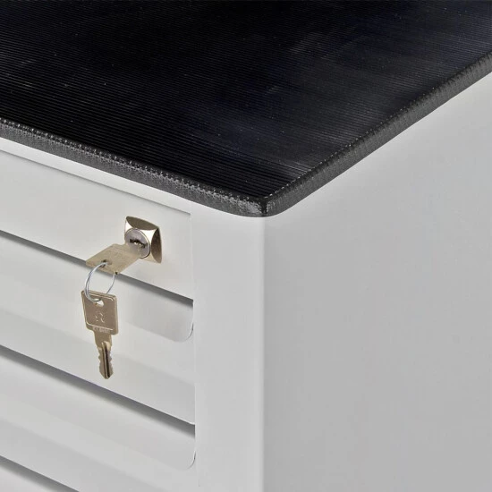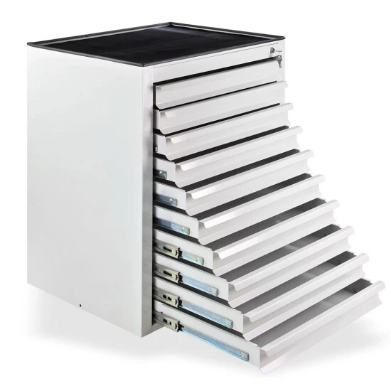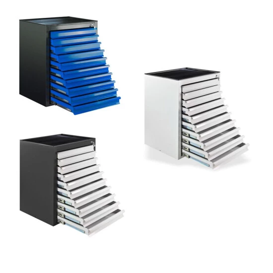 Der ADB Schubladenschrank MAMMUT ist mit einer pulverbeschichteten Stahlausführung ausgestattet. Er verfügt über 10 Schubladen mit Kugelgelagertem Vollauszug. Die Zentralschließung über das Zylinderschloss sorgt für ein sicheres Aufbewahren von Gegenständen. Zudem ist der Schubladenschrank gegen unbeabsichtigtes Öffnen gesichert. Es besteht die Möglichkeit den Schubladenschrank auch mit mehreren Schränken zu verbinden. Eine Gummimatte dient als Ablagefläche auf dem Schubladenschrank. Ideal für Büro, Konferenz, Werkstatt, Garage, Haushalt etc…