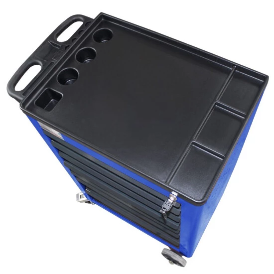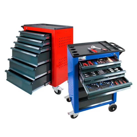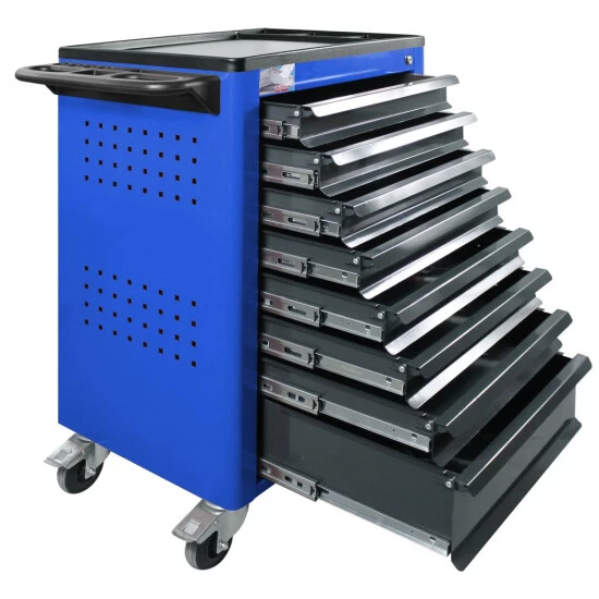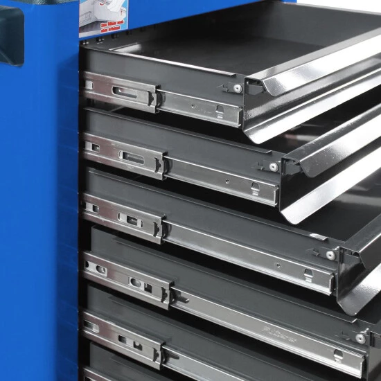 Dieser Werkstattwagen aus solidem Stahlblech bietet Ihnen diverse Schubladen, die enorm belastbar sind. Jede Schublade können Sie sich so einteilen, wie Sie es brauchen. Da die Schubfächer zu 100% ausziehbar sind, haben Sie bequem Zugriff auf den Inhalt. Und wenn Sie nicht möchten, dass andere sich an Ihrem Werkzeug bedienen, können Sie den Werkstattwagen auch jederzeit abschließen.